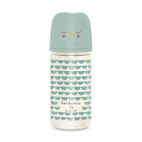 Biberón de Suavinex Vidrio 240ml con Chupón SX pro fabricado en vidrio que no absorbe olores, sabores, ni colores de los alimentos y resiste a los cambios bruscos de temperatura. Parte de nuestra colección Bonhomia.