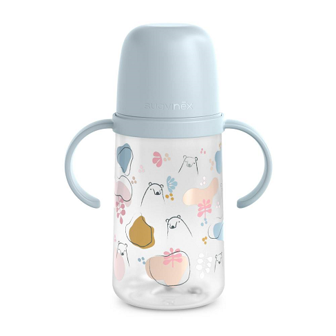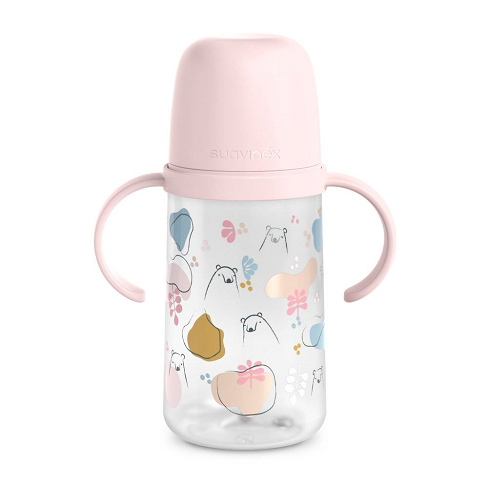 - Biberón de la colección Basics de Suavinex con chupón redondo de 3 posiciones que se adapta al ritmo de succión del bebé o al tipo de alimento, solo girando el biberón.