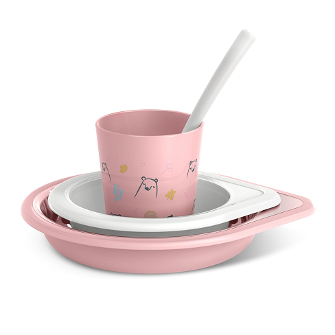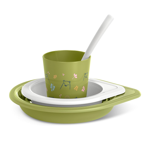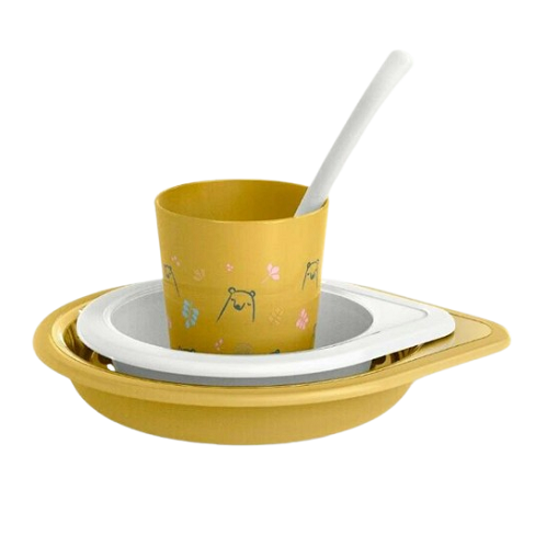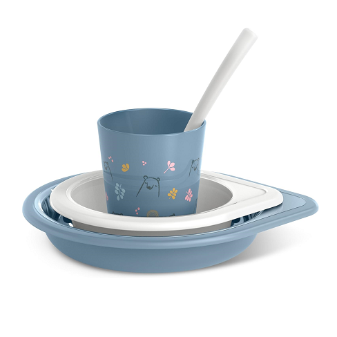 - Compuesta por plato hondo grande (450ml) y plato hondo pequeño (300ml), taza con asa que facilitan su agarre y una cuchara.
